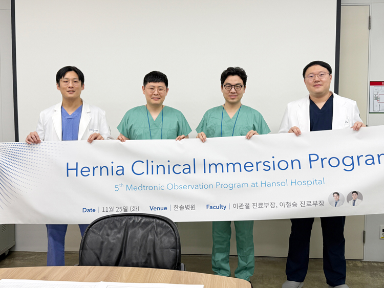제5회 Hernia Clinical Immersion 프로그램 지난 2024년 7월 한솔병원이 메드트로닉 코리아 '자가고정 메쉬 탈장수술 공식 트레이닝 센터'로 지정됨에 따라 2025년 11월 25일 제5회 Hernia Clinical Immersion 프로그램이 진행되었습니다.