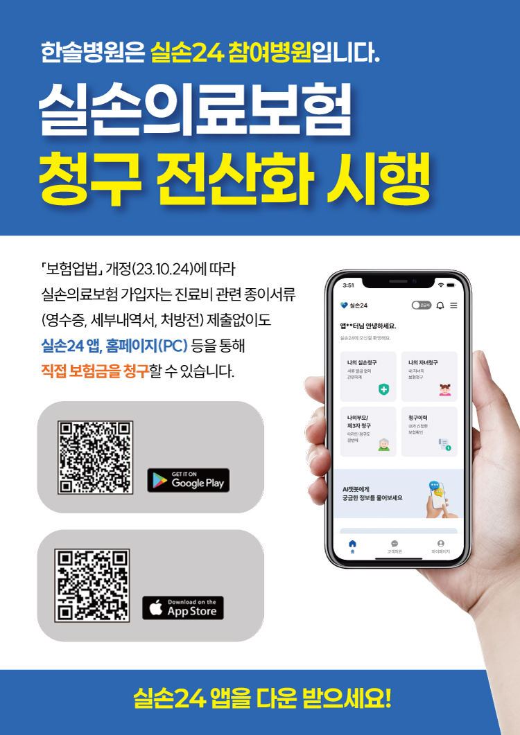 한솔병원 실손의료보험 청구 전산화 시행 한솔병원은 환자분들의 편의를 높이기 위해 실손24 전산청구 서비스를 시행하게 되었습니다. 「보험업법」 개정(23.10.24)에 따라 실손의료보험 가입자는 진료비 관련 종이서류 (영수증, 세부내역서, 처방전) 제출 없이도 실손24 앱, 홈페이지(PC) 등을 통해 직접 보험금을 청구할 수 있습니다.